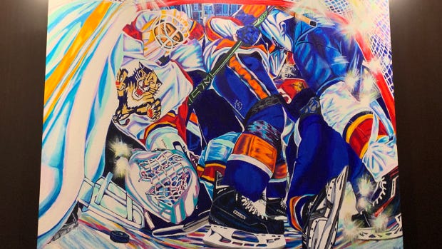 In The Hockey News, Stefen Rosner, on-site at Thursday’s game in Sunrise, FL, tells us about an intriguing piece of art that hangs in The Amerant Vault, a premium lounge at the Panthers Arena. It’s of legend Roberto Luongo looking at the puck in the net after John Tavares’ wraparound goal in Game 6 of the 2016 Stanley Cup Playoff series between the teams. Why would a lowlight in franchise history hang in a prominent location? We do not know.