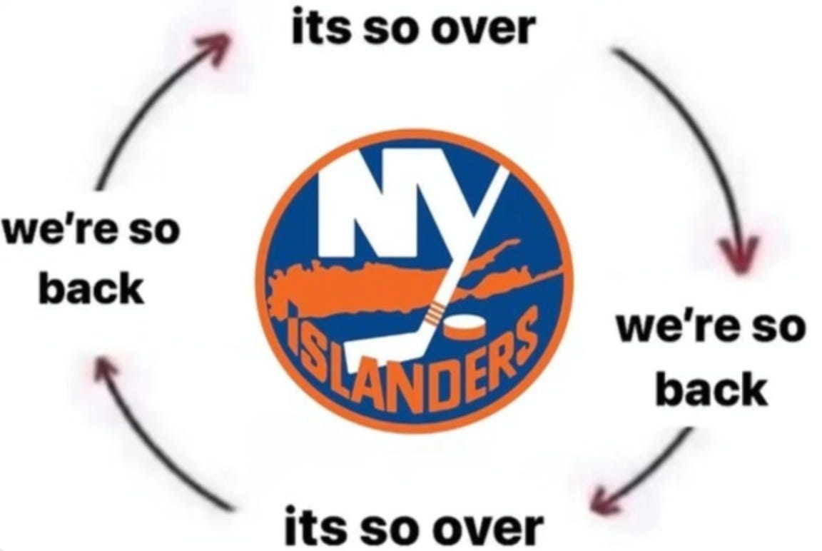 I grew up in Brooklyn. My college roommate is from Long Island. I’m on a group chat with him and his family, all big Islanders fans. It’s not the most active chat, but at different points of the season, we air our grievances or irrational reasons for optimism. Last night, shortly after they closed out a 3-2 win in Florida, they shared this image which encapsulates the continuous loop of this season.