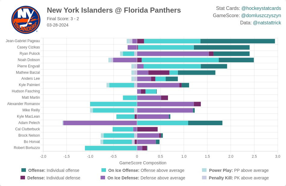 🔷 After Aleksander Barkov gave the Panthers a 2-1 lead, Mathew Barzal set a career-high in goals at the 8:43 mark when he redirected a shot from Noah Dobson to the game.