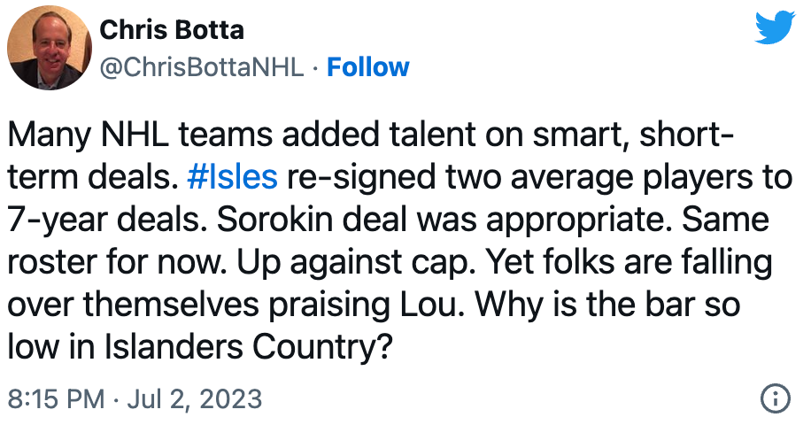 Seeing the majority of fans applauding the deals led to former VP of Communications Chris Botta asking, "Why is the bar so low in Islanders Country?"