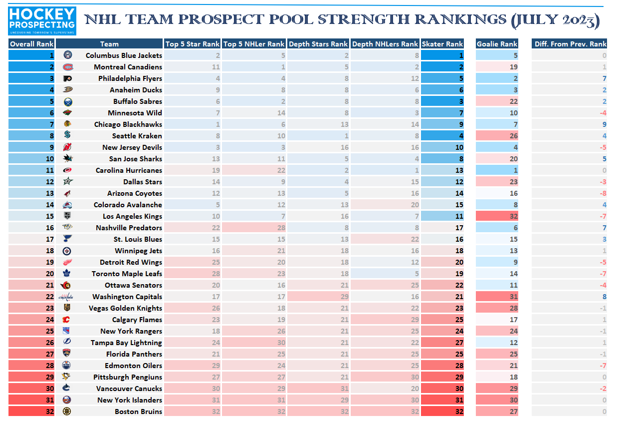 Near the bottom of the Team Strength Rankings by Byron Bader of Hockey Prospecting, Bader's chart has the Isles prospect pool ranked 31st in the NHL.