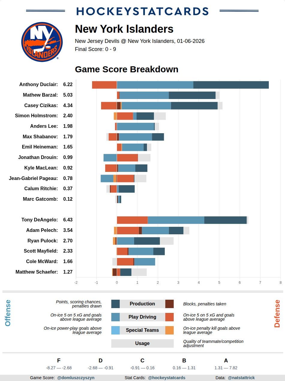 The Devils dictated large chunks of play. They fired. They pressed. They even looked like the sharper team at times by the eye test. Sorokin had to be good early — very good — and he was. But when the puck went the other way, it kept ending up in the net behind them. Barzal. Duclair. Then Duclair again. And again.