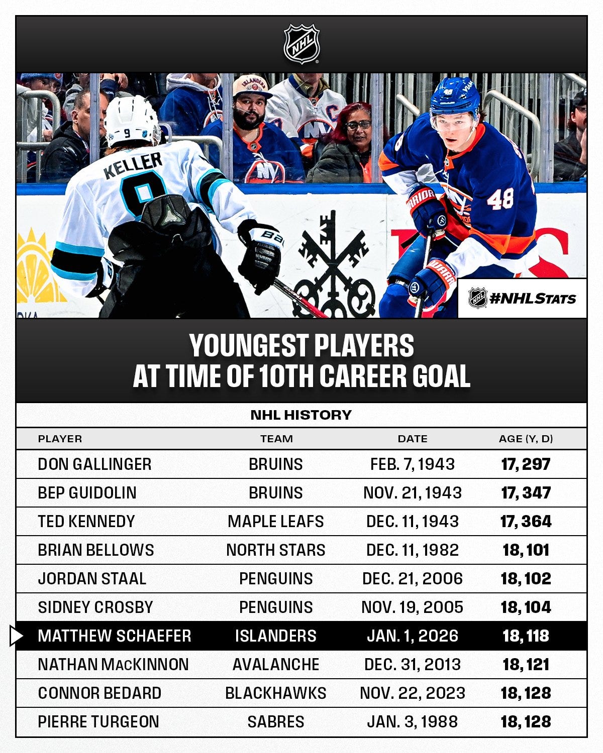 📚 SOUND SMART: Per NHL PR, Matthew Schaefer (18 years, 118 days) became the youngest defenseman in NHL history to reach 10 career goals, besting the previous mark set by Phil Housley (18 years, 320 days on Jan. 23, 1983).