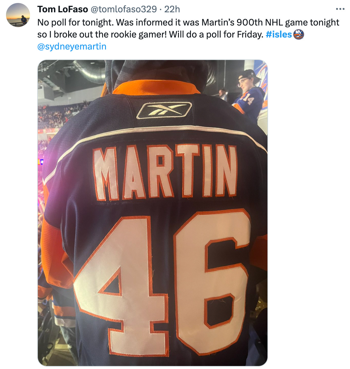 And we leave you with this…Tom LoFaso wears an Isles jersey to every home game. And in honor of Matt Martin’s 900th game, pulled out a No. 46! Reebox Edge. Nicely done.